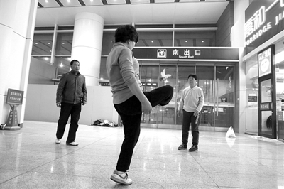 “踢毽子、扭秧歌,干啥的都有。”昨天,北京南站进站大厅地铁C出口处的一商铺工作人员表示,每天傍晚6点左右开始,就会有附近居民陆续带着各种健身“装备”,到站内运动,“有老有少,但老人居多。”