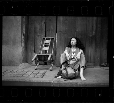 于是第二天,三毛和肖全到柳荫街瞎逛拍照。在往巷子深处走去时看见了一家保留完好的木板房,门锁着,主人把一张竹椅倒扣在门上,“我们俩几乎同时喜欢上了这个背景。我让她坐在那里,她没动那张竹椅,痛快地席地而坐。我连拍了三张,她又干净利落地把脚上的皮凉鞋脱下来,扔到一边,直觉告诉我,要出东西。”最后这张照片被三毛评价为“完美,无价”。