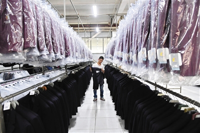 4月18日,工人在容城县服装工业园车间内整理成品服装。新华社记者 杨世尧 摄