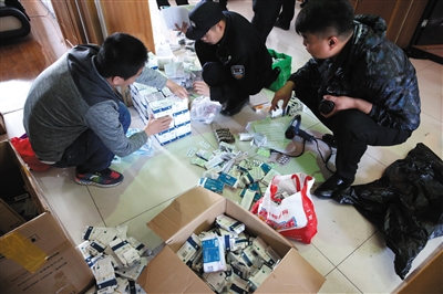 门厅的地上,数千白色药盒、皮筋绑着的说明书、电子监管码和成板的药粒堆成“小山”,藏在卧室床下、衣柜里的数千盒假“立普妥”被环食药旅总队食药支队的民警一盒不落地翻出,客厅内,开奥迪车、向房东称在六里桥“倒腾服装”的房客老吴正冲墙站着,双手被铐。
