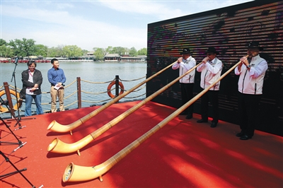 4月20日,什刹海畔,来自瑞士蒙特勒市的山笛表演。当天,第十六届什刹海文化旅游节开幕。据介绍,此活动已连续举办15届。本届什刹海文化旅游节将以“览古都风貌 品京韵文化”为主题,精心策划安排了“1+4”的活动内容,即一场开幕式和“创意旅游、文化旅游、体验旅游、惠民旅游”四个板块共11项主题活动。活动将持续到6月底。新京报记者 李飞 摄影报道