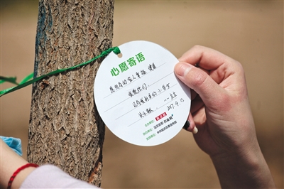 一名种树人员将“心愿卡”系在树苗上。