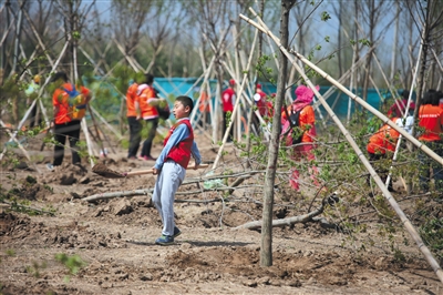小男孩今年12岁,名叫马北冀,这是他首次和家人参加新京报的植树活动。