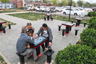 昨日,永定河路西木社区,男士在休闲绿化带里下棋。近日,该处永定河路进行改造,拆除原来的违建,新建绿化带,健身路径,停车场,运动场等。 新京报记者 王嘉宁 摄