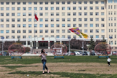 昨日,河北雄县政府前,市民在放风筝。4月1日,中央宣布设立雄安新区,涉及河北省雄县、容城、安新3县。新京报记者 王嘉宁 摄