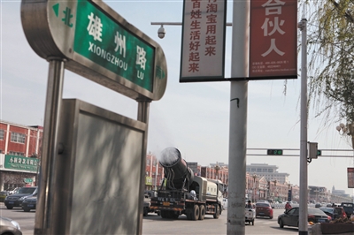 昨日,一辆雾炮车在雄县街头作业,以减少扬尘,改善环境。新京报记者 王嘉宁 摄