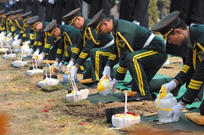 哀乐响起,全场人脱帽、低头,为逝者默哀。伴随着柔缓的音乐,服务人员手持黑色大伞护送着手捧逝者骨灰坛的仪仗人员来到“落英缤纷”草坪。每位仪仗人员就位后,单膝下跪,将逝者的骨灰坛放入已经准备好的土穴中。