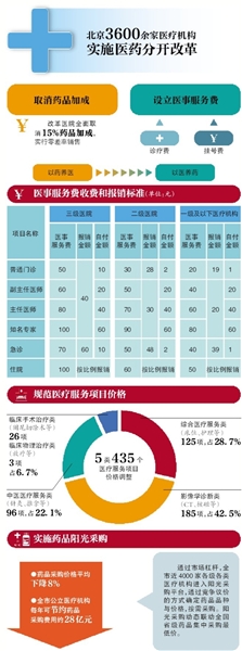 北京此次医改的各医疗机构将全部取消药品加成(不含中药饮片)和挂号费、诊疗费,设立医事服务费,所有药品实行零差率销售。