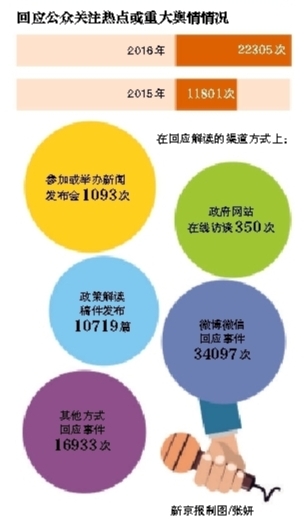 2016年,北京全市回应公众关注热点或重大舆情22305次,比2015年的11801次增加近九成。在回应解读的渠道方式上,参加或举办新闻发布会1093次;政府网站在线访谈350次;政策解读稿件发布1万余篇;微博微信回应事件3.4万余次;其他方式回应事件近1.7万次。