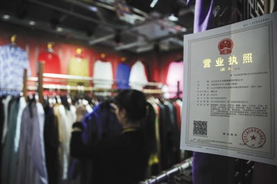 昨日,秀水街一家商铺门口贴着刚发下来的营业执照,商铺正式由个体户转为企业经营,该服装店铺也有了自己的设计师和品牌。新京报记者 彭子洋 摄