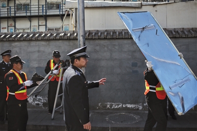 “这种指示牌不符合城市的交通标识规范,也没有经过市政市容管理部门的审批,属于私自设置的违规交通指示牌。”施工现场,朝阳区劲松街道办事处副主任封钢表示,这种私自悬挂的牌子有很大安全风险,如果安装不牢固掉下来的话,会砸到路边的行人,这种情况以前也有发生,所以这类牌匾都要清除。
