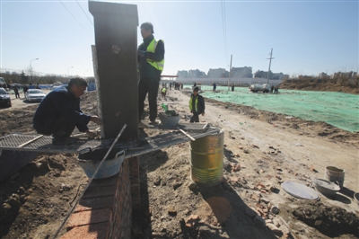 常营乡25天腾退拆除6万平米违建的土地将全部用于建设绿地。昨日,工人们已经开始修建常营体育公园的围墙。新京报记者 王飞 摄