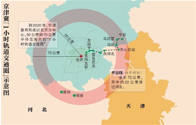 2020年,以北京为中心,50公里到70公里半径范围内,京津冀将形成“1小时轨道交通圈”,其中将建成约1000公里区域快线连通京津冀三地。
