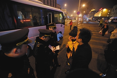截至21点30分,执法人员共查处两辆非法营运车辆,一辆是无证运营的大巴,另一辆为违规运营的非京牌网约车。