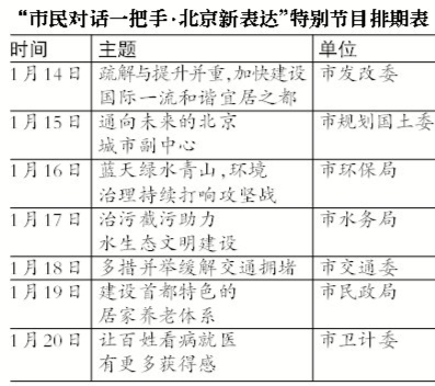从1月14日起,市发展改革委、市规划国土委、市环保局、市交通委、市水务局、市民政局、市卫生计生委等7家政府部门的“一把手”,将走进北京广播电视台位于市“两会”现场的演播厅,通过电波、视频、网络、客户端等多种形式,与市民进行对话沟通。节目将采用直播、录播和网络互动等多种形式,每天早上7:30到8:30在FM107.3、AM1026北京城市广播直播播出。首都之窗、千龙网和北京时间也将同步网络直播。