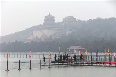 昨日,施工人员在颐和园昆明湖冰面上搭建冰场设施。由于今年冬天的气温偏高,市内各家天然冰场相比以往纷纷“爽约”。近日随着气温降低,湖面冰层厚度也日益增加。昨日,颐和园昆明湖内有工人开始搭建冰场。今年颐和园昆明湖上开辟70万平方米的冰场,也是本市最大的天然冰场。据工人介绍,此次冰场娱乐项目除传统的冰车、冰上自行车、电动冰船、冰上碰碰车外,还将在颐和园西堤镜桥旁的湖面上,首次搭建起一座6米高的冰滑梯,开放时间将与冰场同步,预计最快下周一开业。图/视觉中国