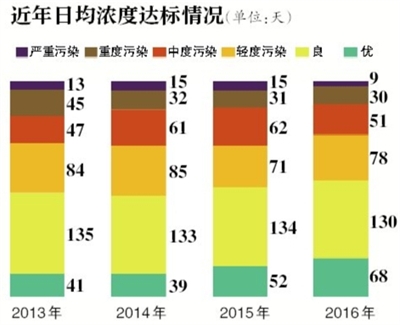 据介绍,2016年北京空气质量达标天数198天,其中,一级优68天,二级良130天,达标天数较2015年增加12天;2016年共发生重污染39天,较2015年减少7天,较2013年减少19天。39个重污染天中,1天为臭氧重污染,其余38天全部为PM2.5重污染。