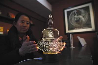 12月22日,北海公园,工作人员介绍特色新年礼物白塔小夜灯。