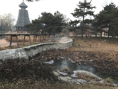 昨日,中华民族园北园景区内,一处高塔建筑旁的水沟内杂草丛生,河水呈现黑色并散发出臭味儿。新京报记者 李婷婷 摄