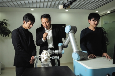 2016年11月18日,王田苗(中)与学生一起讨论医疗机器人的操作细节。新京报记者 彭子洋 摄