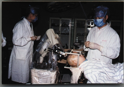 1997年,王田苗(左)与田增民合作,首次完成机器人辅助立体定向神经外科手术。