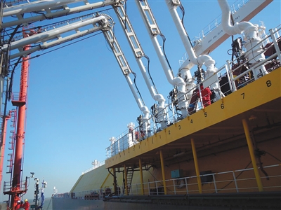 昨日,曹妃甸码头,液化天然气运输船的卸料臂正在向接收站输送液化天然气。北京市燃气集团供图