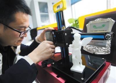 10月13日,燕郊高新区创业中心,3D打印技术创业公司创始人正在操作3D打印机。本版摄影/新京报记者 王贵彬