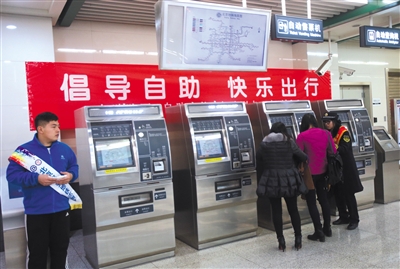 15日上午,地铁公司以“倡导自助、快乐出行——自助购票、自助充值、自助刷卡、自助乘车”为主题,在这四条线路上结合站区长接待日,开展自助服务宣传活动。