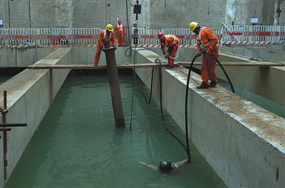 城市地铁使用蛙人水下挖掘基坑并灌浆尚属全国首次。“绝大部分挖掘工作由大型机械完成,但仍有部分位置大型机械难以精准挖掘,就需要蛙人在水下帮忙定位,必要时由蛙人在水下用高压水枪作业。”工程项目总工李辉介绍。