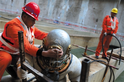 涌上来的石块泥浆伤不到徐祝东,他头顶着的是一个高强度头盔,身上的潜水服也有多层设计,不漏水还保温。在上百斤的配重下,他可轻松沉到水下。他说,在水下是看不到的,所有作业只能靠手感。“摸到鹅卵石壁就是我们要打的。”为此,他不能戴防护性更好的橡胶手套,只戴了一副最常见的白色线制手套。