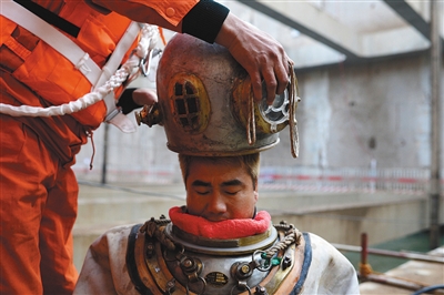 早晨7时许,工友帮潜水员郭中昊戴上头盔。