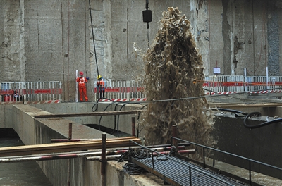 “这个挖掘的位置是地铁站的站台层,以后这下面就铺轨道。”现场总指挥说,大概有2米进深的距离大型挖机无法作业,只能靠蛙人潜入泥水中找准位置用冲击枪一米一米地掘进。