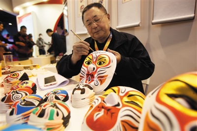 东城区非物质文化遗产“京剧脸谱绘制”项目传承人盛华在现场进行京剧脸谱绘制。蓝脸的窦尔敦,白脸的曹操,描出火眼金睛的孙悟空——在盛华的手中,脸谱不但是油彩的拼画,也是京剧人物灵魂的再现。