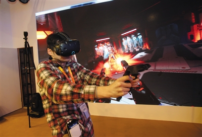 上午,在东城主会场展区,一场VR枪战大片上演,体验戴着VR眼镜化身英雄,进入暗黑的地下宫殿与魔怪战斗。“动起来,您要把看到的场景当成是现实世界。”主持人引导体验者躲避攻击,体验在台上左右腾挪。这款VR游戏的开发公司就是东城的企业,他们从密室游戏起家,去年以来融合了VR技术,已在全国开了十多家加盟店。