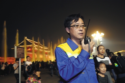 10月2日,肖晨在调度天安门广场上的环卫车。除了清扫垃圾,天安门的环卫工人还要应对庞大的人流。新京报记者 薛珺 摄