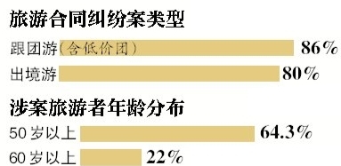 二中院调研发现,在近年审理的旅游合同纠纷案件中,跟团游的比例高达86%,其中不乏暗藏玄机的“低价团”;而纠纷案的当事人中,50岁以上的占64.3%,60岁以上的占22%,涉案旅游者呈现“大龄化”趋势。此外,在统计案件中,出境游占到了80%,纠纷发生多因签证、航班延误等问题处理不当。
