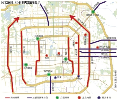 9月29日、30日是9月的最后两个重点拥堵日。29日(周四)恰逢尾号4、9限行,预计当天路网交通压力大,特别是晚高峰路网交通指数预计达到8.5,处于严重拥堵级别。30日(周五)是国庆节前最后一个工作日,节前购物、聚会增多造成出行量增加,部分市民会选择提前出游,出京流量将进一步增高,预计30日晚高峰指数将达到8.2,严重拥堵。建议市民错峰出行,尽量采取公共交通方式出行。