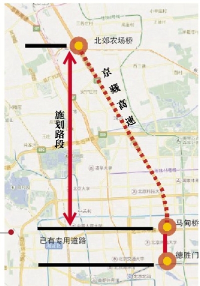 京藏高速公交专用道施划路段为北郊农场桥至马甸桥,施划长度为27.6公里(双向),设在主路最内侧车道,早晚高峰潮汐使用,使用时间为早高峰7:00-9:00(进城方向)和晚高峰17:00-19:00(出城方向)。