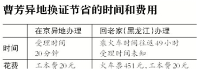 昨日11时,记者来到北京市公安局朝阳分局团结湖派出所的户籍大厅,在这里遇到了户籍为黑龙江省友谊县的曹芳(化名),她告诉记者,自己的身份证今年2月份到期后一直没换领新证,听说黑龙江省的户籍人口也可以在北京办证了,正好休息就过来办理。