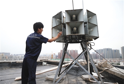 昨日,北京石油化工学院,一名民防队员正在检查防空警报。新京报记者 尹亚飞 摄