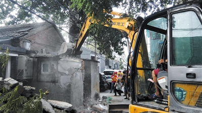 随着挖掘机的机械臂一起一落,又一处私搭乱建的居民自建厨房被拆除。昨天上午,北新桥街道综合执法组联合城管等多部门进行了该地区最大规模拆违整治工作,共将拆除北新桥新太仓片区200余处违法建筑,共涉及17条胡同,恢复胡同原貌。