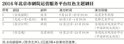 2016年北京市剧院运营服务平台第一阶段演出已于5月16日正式启动,一直持续到8月底,35台剧目陆续在京城14家剧场亮相。随着平台演出的发展,第二阶段剧目评审工作得到了全国各大优秀剧团的大力支持和热情参与。2016年以“纪念建党95周年和红军长征胜利80周年”为中心,70余部来自北京、天津、河北、河南、上海、陕西等11个省市的优秀剧目前来申报。经过专家评审,最终有17台剧目入围了第二阶段展演。其中包括北京雷动天下现代舞团的原创大型现代舞剧《九死一生·长征》,北京市京昆文化艺术团的原创京剧《大钊先生》,北京曲剧团的曲剧《徐悲鸿》等红色剧目。