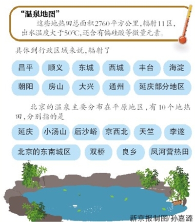 孙连喜介绍,北京的温泉主要分布在平原地区,有10个地热田,分别指的是延庆、小汤山、后沙峪、京西北、天竺、李遂,以及北京的东南城区、双桥、良乡和凤河营热田。“具体到行政区域来说,辐射了昌平、顺义、东城、西城、丰台、海淀、朝阳、房山,以及大兴、通州、延庆的部分地区。”