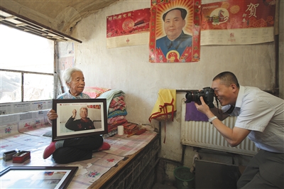 4月24日,延庆展出了450余张老党员照片,摄影师亲自将王老太太的照片送到她的家中。新京报记者 彭子洋 摄