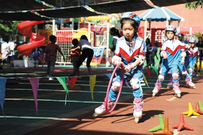 6月16日,丰台区嘉园第一幼儿园操场上,孩子们有的在玩抖空竹、跳竹竿;有的则脚蹬轮滑成为小小“追风少年”……这是嘉园一幼开设的37门健康教育课程与活动中的一部分。