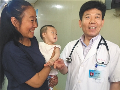 在医院,手术前的“小粽子”状态良好,高兴地抓着主治医生的手不放。新京报记者 李馨 摄