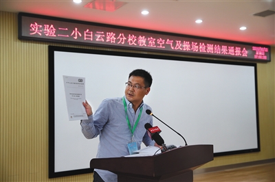 西城区环保局环境保护监测站站长、高级工程师韩佳真公布了学校室内空气检测、操场检测结果。检测报告显示,白云路实验二小教室空气检测样本中按国家规范要求的苯、甲苯、二甲苯、甲醛、TVOC(总挥发性有机物)等5项指标抽检的16间教室中,15间符合国家相关标准,有1间音乐教室甲醛超标。