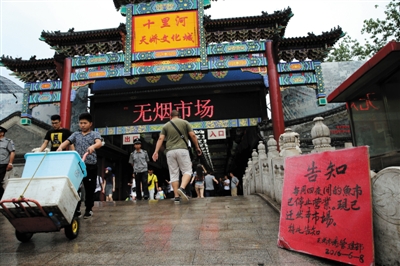 昨日,十里河天娇文化城,门口的告示牌上写着每周四夜间的鱼市停业的消息。新京报记者 薛珺 摄
