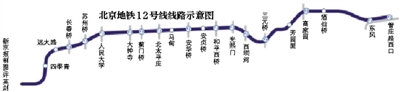 《北京地铁十二号线工程环境影响报告书》在中国铁道科学研究院进行公示。12号线线路西起西四环四季青桥,沿西四环路向北至远大路转向东,经长春桥路下穿苏州桥后进入北三环路;线路沿北三环路向东到光熙门转向南,在三元桥沿机场高速路转向东北,下穿东四环路后进入酒仙桥地区;线路沿芳园西路、万红路穿过酒仙桥地区后,下穿东五环路进入东坝组团北区,并结合东坝国际商贸区规划在东坝北区设置终点站。线路经过海淀区、西城区、东城区、朝阳区四个城区,共有20座车站,在起点西四环外设置田村停车场一座。新京报记者对比此前发布的线路图发现,此次公示取消了霄云桥站。