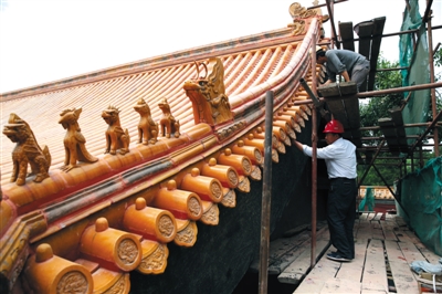 对于这些文物方面的“专业词汇”,上述负责人向记者解释道,因为屋面上的瓦件全部脱釉,要把这些瓦拆下来,把瓦下面的灰背、泥背铲除,看一下房屋的木结构有没有问题,如果有问题,就把糟朽的木构件更换,再重新上灰和泥,把破旧的瓦更换掉,补上一些新瓦。